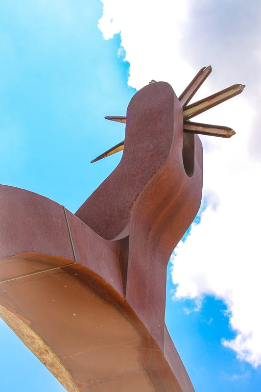 Created by Larry Houston, his one-ton steel production measures 20ᕁ28 feet! Until 2017, it was certified as the World's Largest Spur by Guinness World Records. The gigantic spur formerly stood at the north entrance of the rodeo arena where the photos were taken but has since moved to Rittel's Western Wear