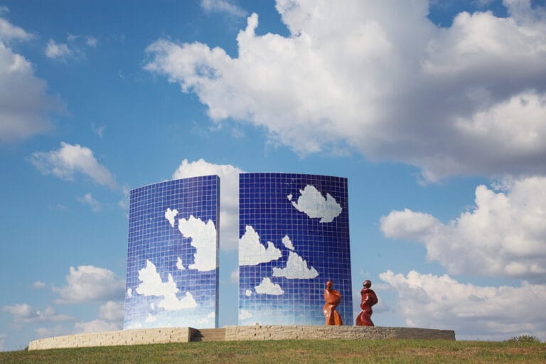 From Main, ½ mile east on 12th, then ¼ mile north on Kansas to Centennial Park. An impressive and large free-standing tile sculpture by artist Phil Epp celebrates the blue prairie skies by positioning the viewer in a juxtaposition between the sculptural imagery and the natural sky. Collaborative artists are Terry Corbett and Conrad Snider. (8 Wonders of Kansas - Art)