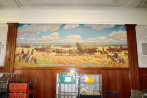 Border Gateways, a 1937 oil on canvas by Oscar E. Berninghaus, depicts pioneers in covered wagons coming into the newly established Kansas Territory in 1854. This WPA Section artwork, although inside the post office, is not publicly accessible. The PO staff would love to show it to you, though. Just ask at the window. Monday-Friday 8 a.m.-5 p.m.; Saturday 8:30-10:30 a.m. (8 Wonders of Kansas - Art)