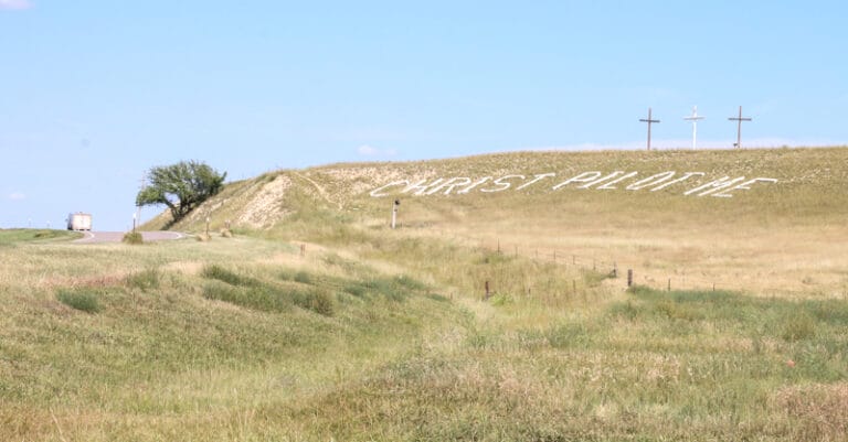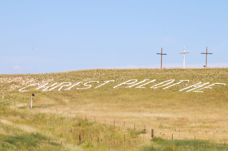 From Main, 2¾ miles east on K-96. Three rock crosses mark the hillside where the words "Christ Pilot Me" are laid in stone. Most visible from the west, the crosses date to 1940 and were a project of the Bazine churches. At the corner just west of the crosses, turn south to see a limestone memorial and informational plaque.