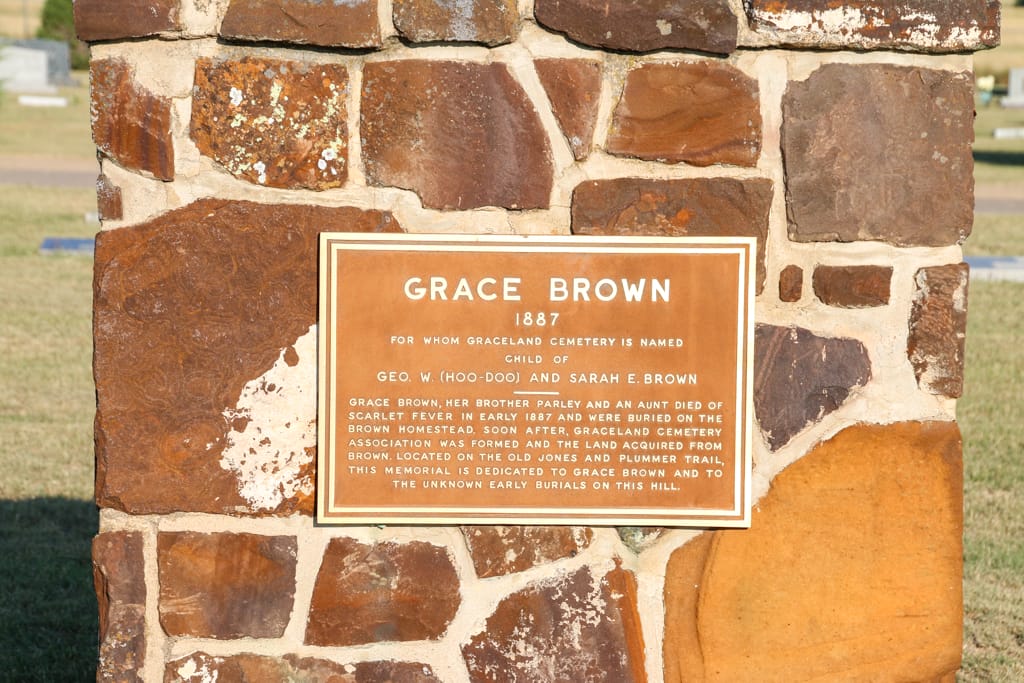 From Fowler St., 1 mile east on Carthage. Situated on the Jones and Plummer Trail, the area south of the cemetery was once the farmstead and trading post of Hoodoo Brown. After the death of his daughter Grace in 1887, Hoodoo sold the land to a cemetery association, which named the cemetery Graceland as a tribute to his daughter. A red sandstone memorial to Grace stands in the cemetery's south-central section.