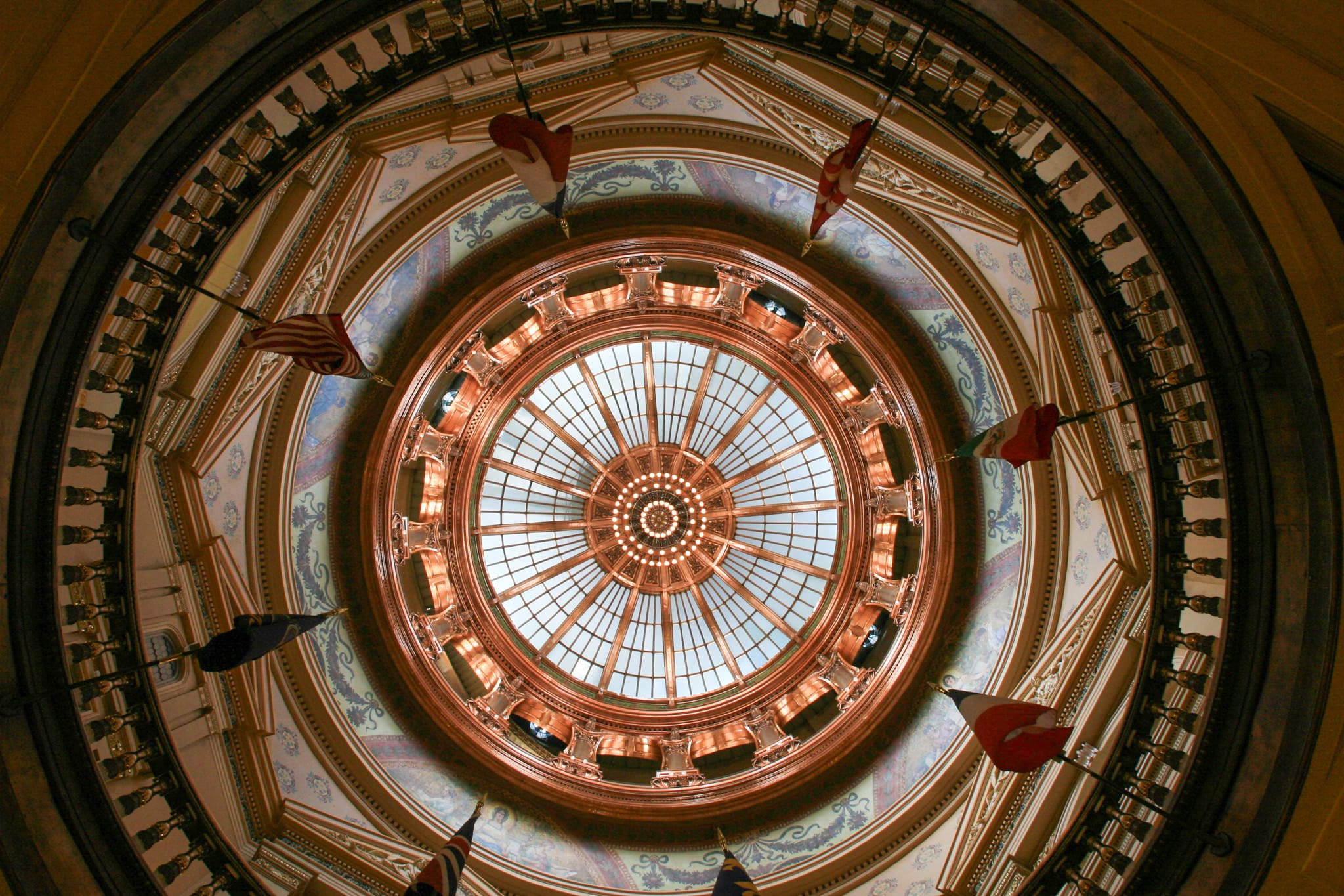 It took 37 years (1866-1903) to build this stately Neoclassical Renaissance structure, and 13 years (2001-2014) to complete a recent renovation. Enter on the north and stop at a visitor center desk to pick up a self-guided tour brochure or learn about guided tours and dome tours (up the 296 steps to the dome). Of major interest in one of the nation's most beautiful state capitols are the stunning murals by John Steuart Curry Lumen Martin Winter, and David Overmyer. The most famous is Curry's "Tragic Prelude" featuring a fierce John Brown holding a Bible in one hand and a rifle in the other. Among other impressive features are the Pete Felten stone sculptures of four famous Kansans in the second-floor rotunda, the majestic stained-glass dome, the marble walls and floors, and the brass and copper staircases. If the legislative chambers are not occupied, step inside to admire the ornamentation that dates to the late 1880s. Standing atop the capitol dome is Richard Bergen's 22-foot-tall bronze sculpture of a Kaw Indian pointing his drawn bow toward the North Star. (NRHP) (8 Wonders of Kansas Architecture)