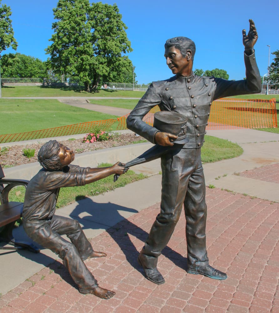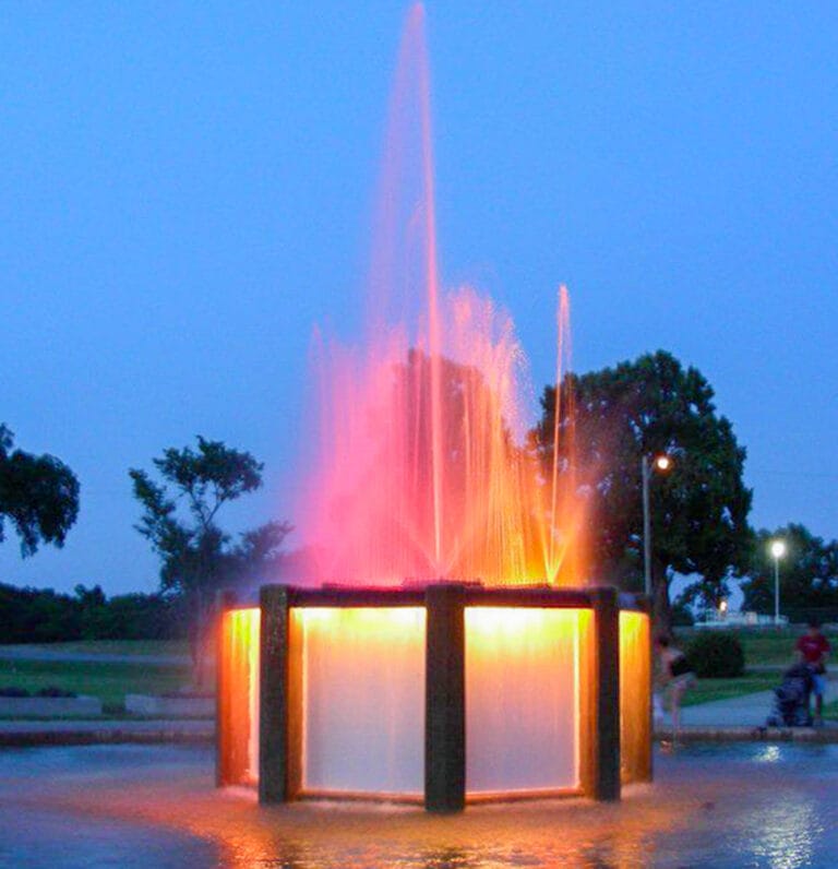 The fountain was added to the park in 1948 as a memorial to Robert Logan, park supporter. A recent renovation has the fountain once again flowing in splendor around the well-landscaped area. On a brick oval sidewalk around the fountain, a life-sized sculpture of William Inge portrays him sitting on a bench with pen in hand. Nearby, three sculpture sets each depict a scene from his plays Picnic; The Dark at the Top of the Stairs; and Come Back, Little Sheba. Fountain Photo: Facebook