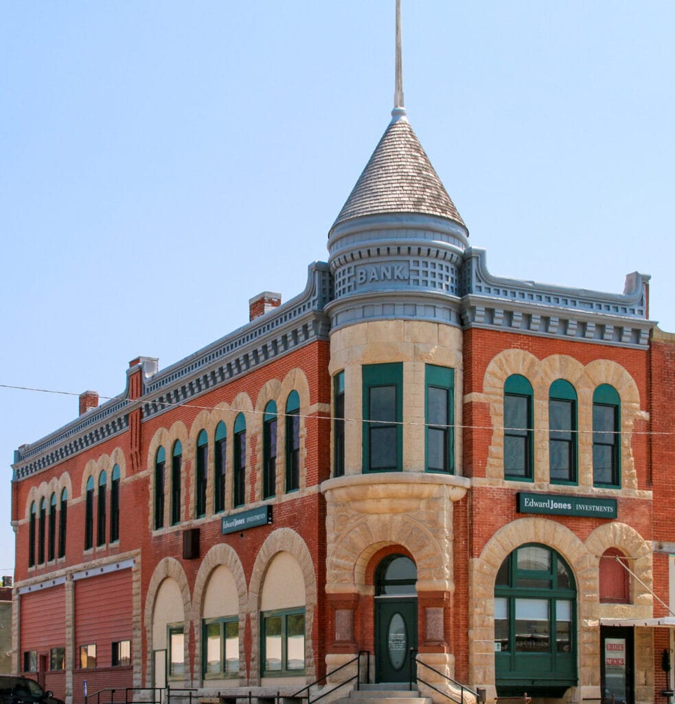 In 1889 J.R. Burrow built this lavish red-brick structure complete with granite pillars, circular steps to a corner entrance, limestone-accented arched windows, and a turret. Over the years the former bank fell into major disrepair, but thanks to local effort, a restoration was completed in 2015. (NRHP)